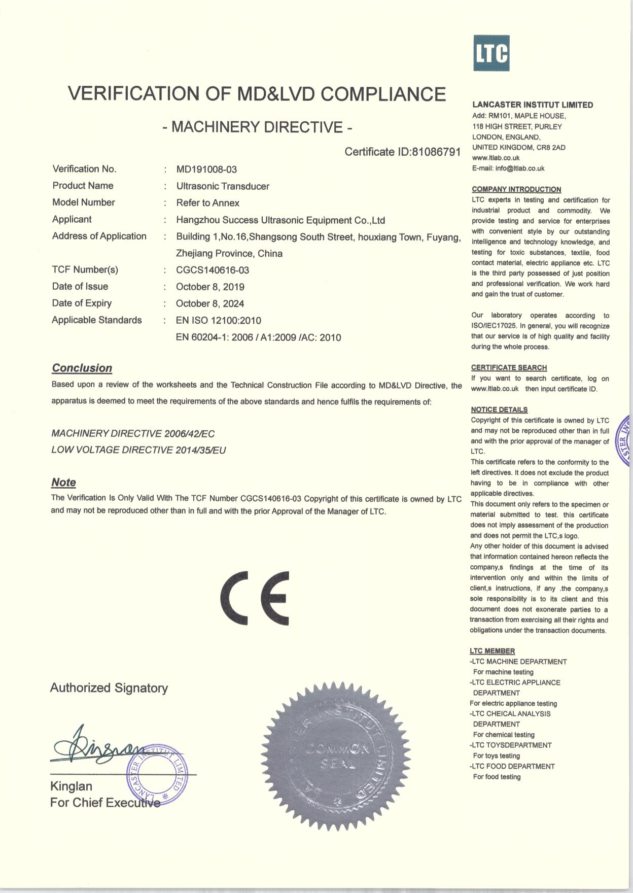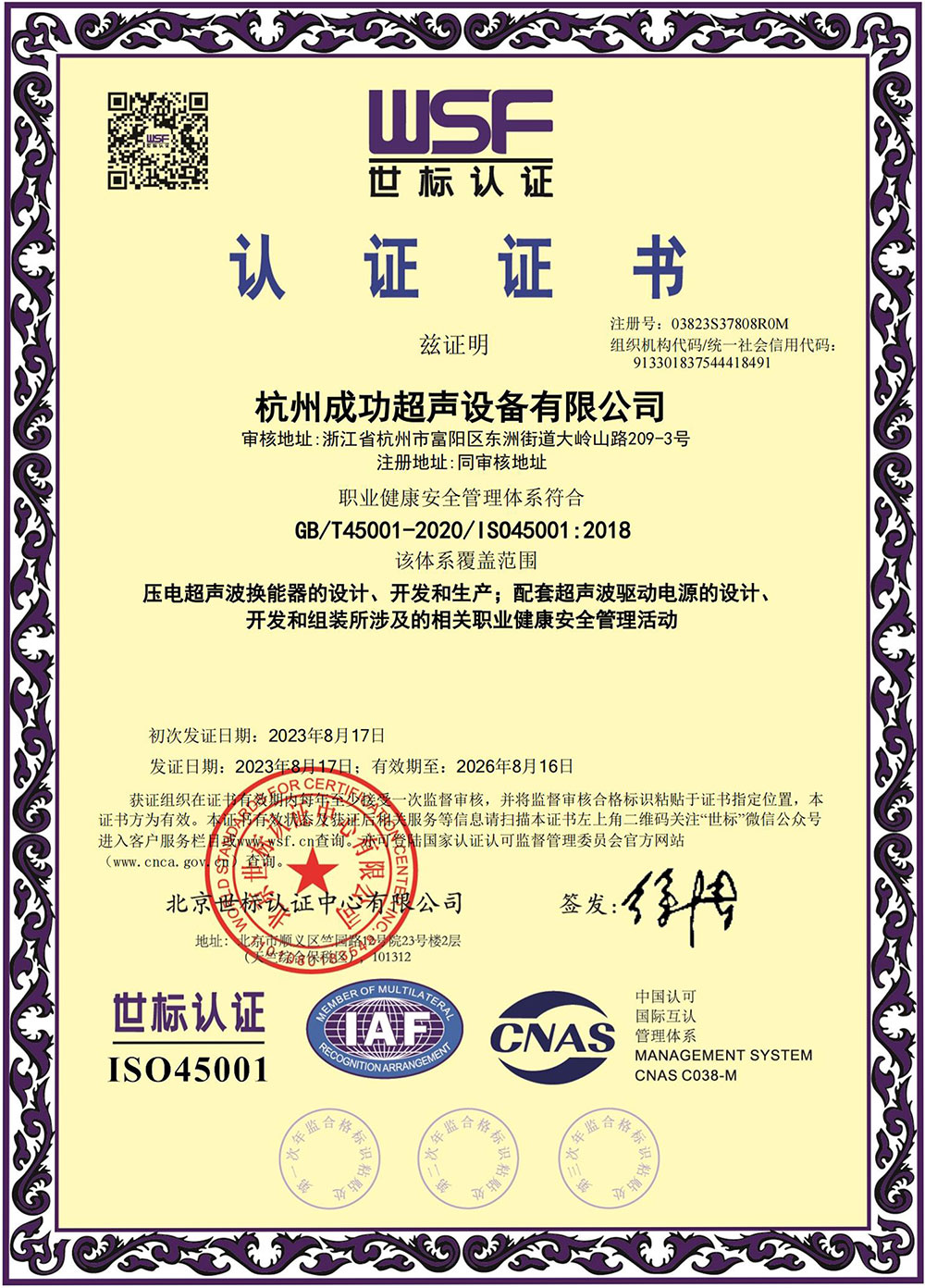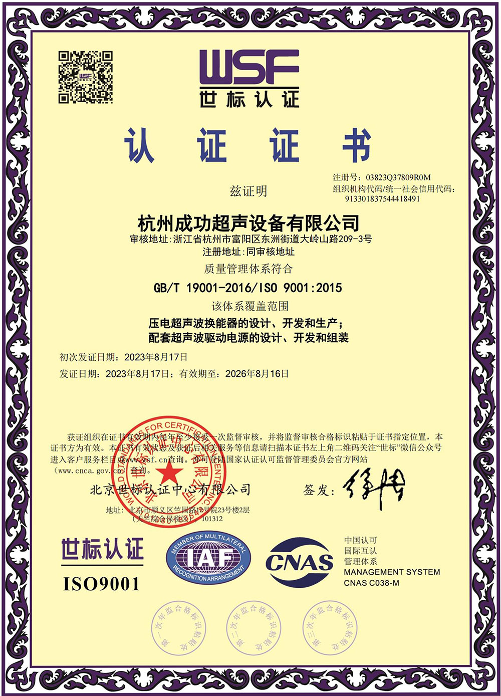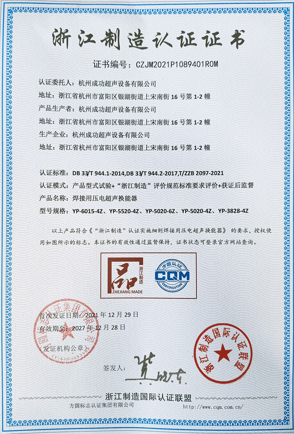 杭州成功超聲設備有限公司創立于1995年,是國內從事超聲應用研究、大功率超聲波換能器開發與生產的專業廠商及國家高新技術企業。公司主要產品有換能器、超聲驅動電源等。這些產品作為功率超聲應用行業的核心關鍵部件廣泛應用于聲化學、塑料焊接、金屬焊接、橡膠切割、無紡布焊接等領域。公司對中國換能器產品進行了行業的命名和行業標準的確定。產品遍布全國并行銷海外多個國家和地區,品質和性能在行業中負有盛名,其中超聲焊接換能器國內市場占有率達到50%以上。